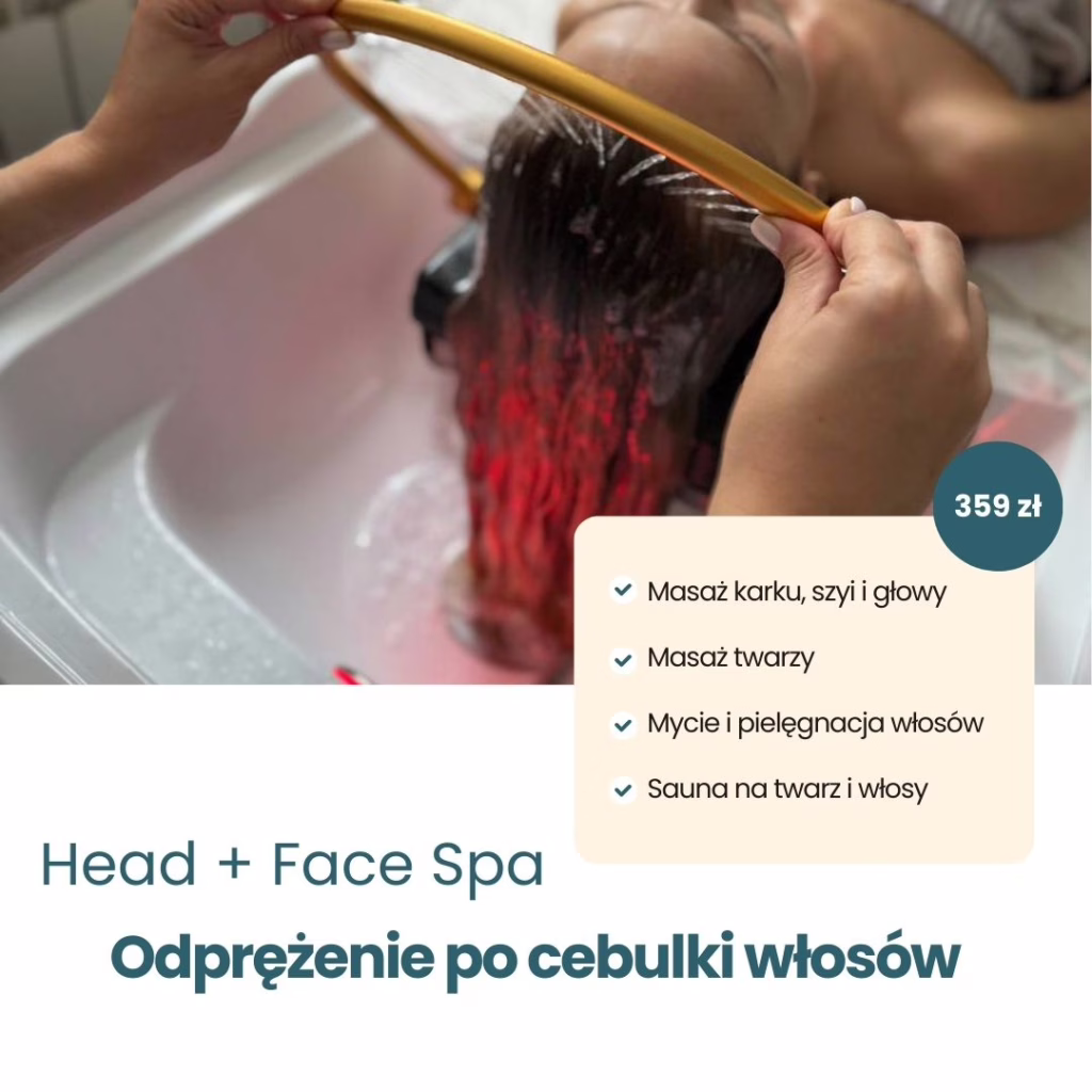 HEAD + FACE SPA „Odprężenie po cebulki włosów” – masaż karku, szyi i głowy + masaż twarzy + mycie i pielęgnacja włosów (peeling + maska + sauna) – 359 zł/ok. 90 min